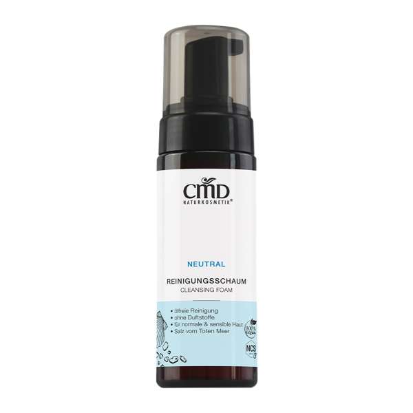 El maquillaje, la suciedad y el exceso de grasa se acumulan mucho en nuestra piel diariamente, así que por la noche debemos limpiar nuestra piel para que pueda regenerarse de forma óptima mientras dormimos. Es más fácil decirlo que hacerlo para las personas con piel sensible y alérgicas porque reaccionan a muchos productos cosméticos que les provocan irritación, enrojecimiento, picazón o incluso descamación. Una espuma limpiadora suave de alta calidad con certificado de cosmética natural puede solucionar este problema. La espuma facial neutra de CMD limpia de forma muy eficaz y al mismo tiempo delicada, ya que proporciona a la piel un extra de hidratación. La sal del Mar muerto además nutre la piel con su alto contenido en minerales